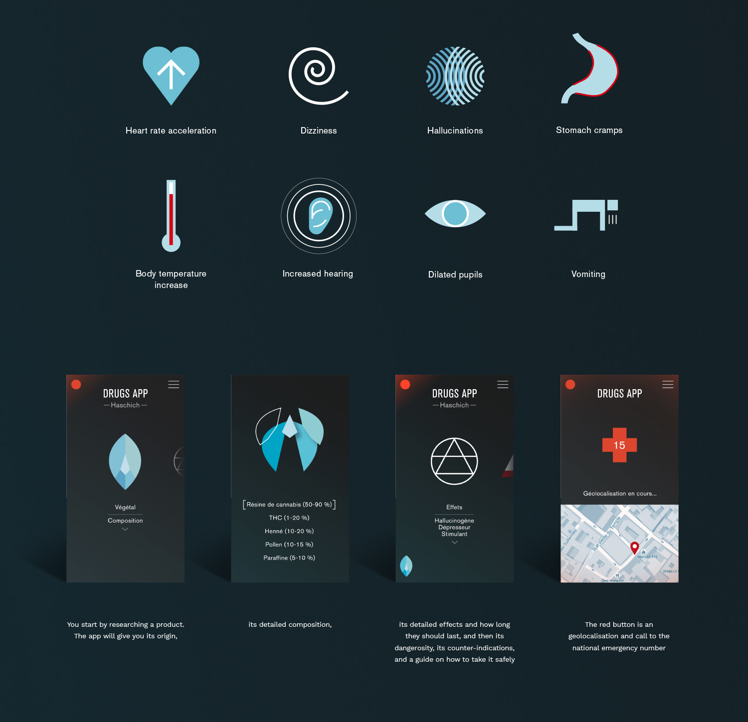 Coming from the principle that drug use will not disappear, this personal project that I realised during my studies is about providing better guidelines for it. The app allows the user to know about the product’s origin, effects and risks, and helps to take it simply and as safely as possible.