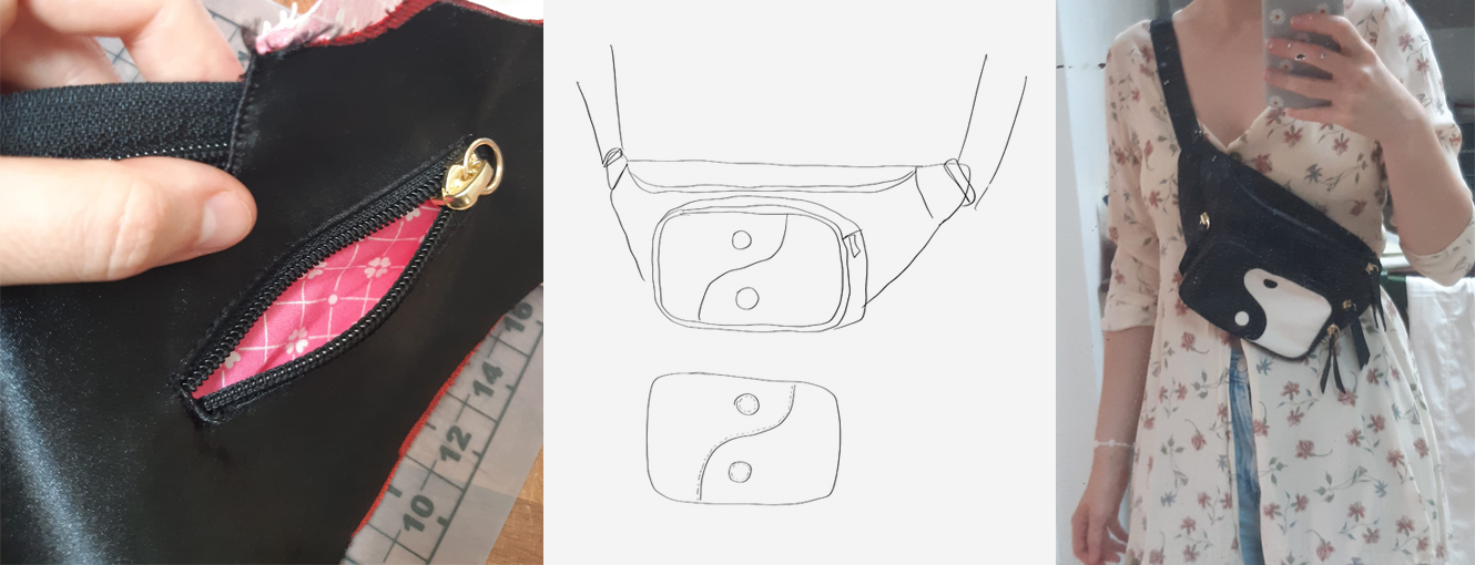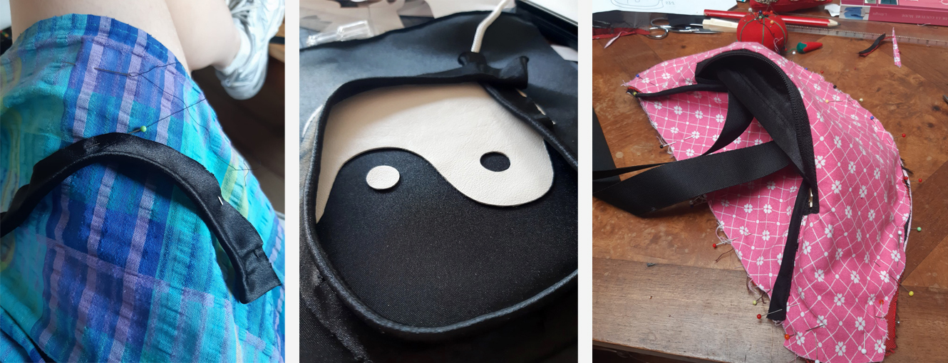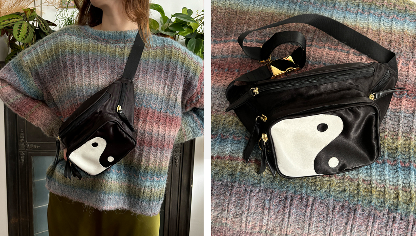 1. Yin Yang bag: Handmade satin piping, leather appliqué, cotton lining and tiny pockets.