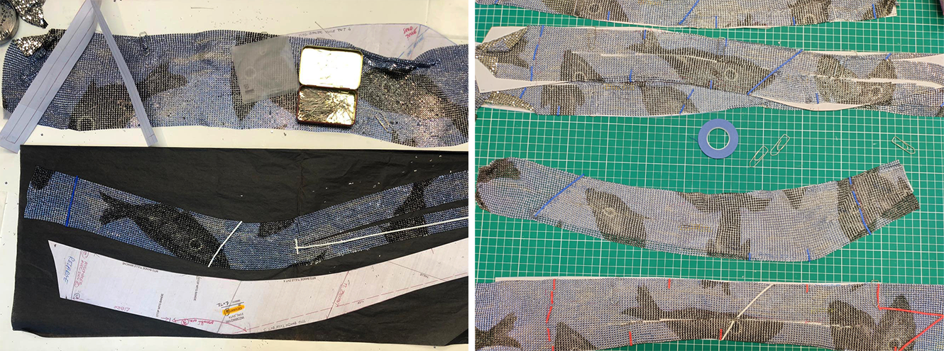 Assembling of chainmail-like squares to create a mesh fabric, then assembling of different pieces on the mannequin to create the dress. In collaboration with a team of embroiderers in Givenchy Paris atelier.