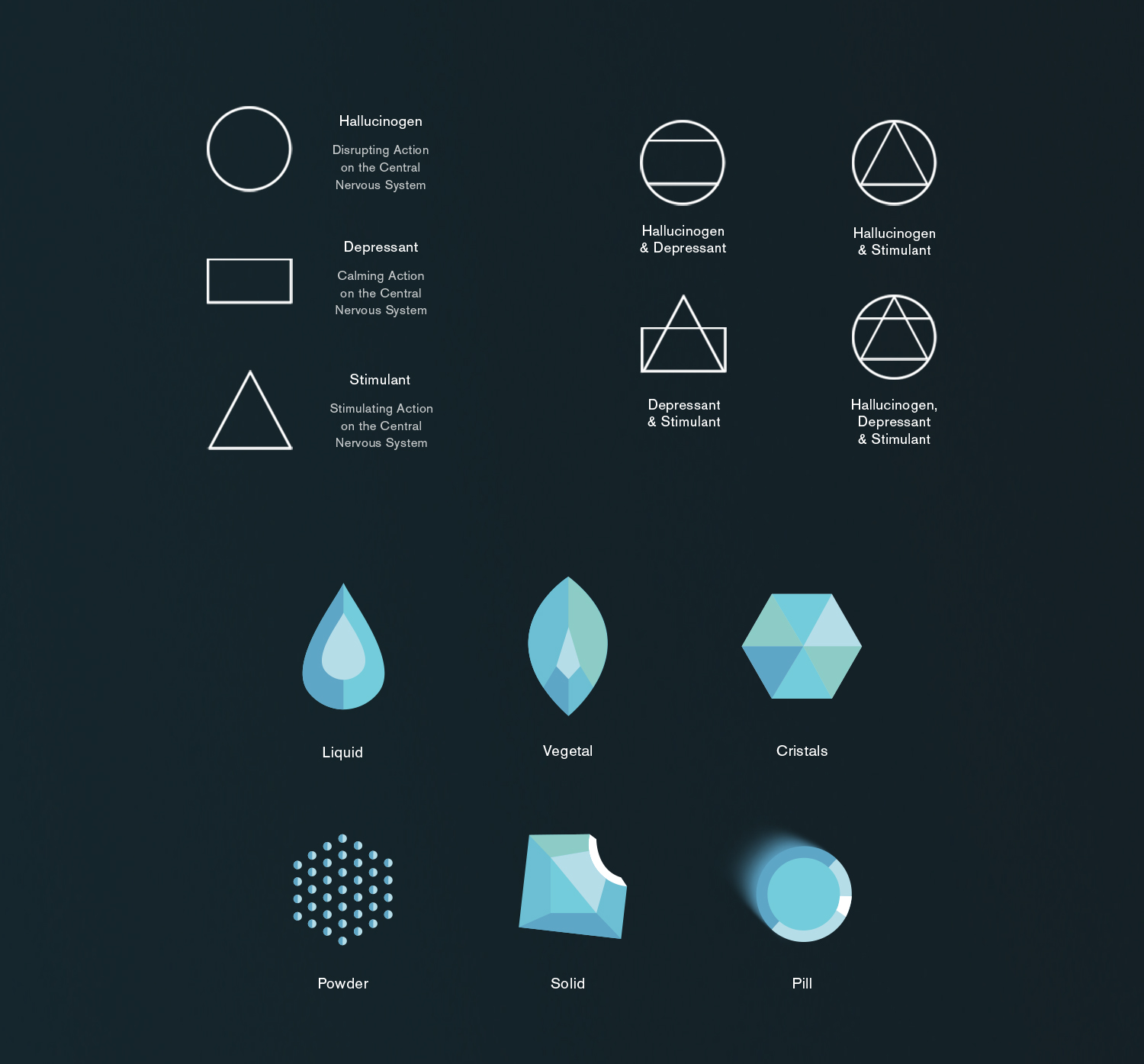 Coming from the principle that drug use will not disappear, this personal project that I realised during my studies is about providing better guidelines for it. The app allows the user to know about the product’s origin, effects and risks, and helps to take it simply and as safely as possible.
